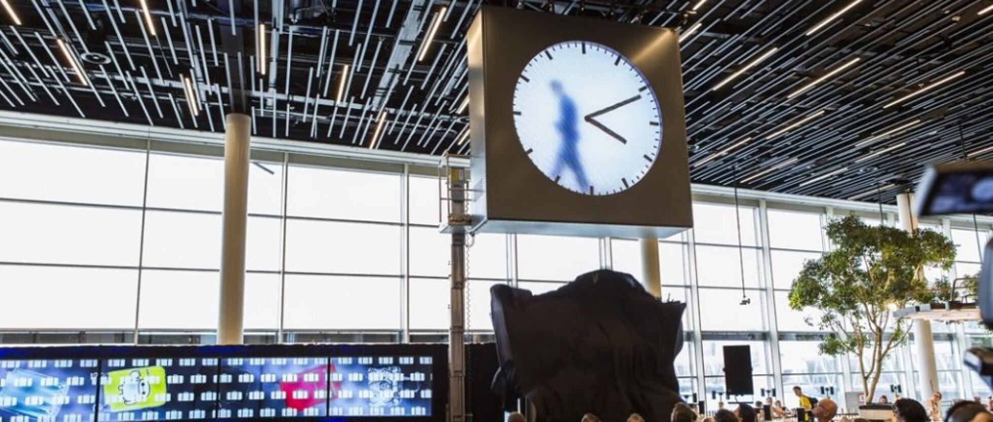 Il designer olandese Maarten Baas ha creato un orologio decisamente particolare e l’ha installato, sospeso a 3 metri da terra, nella nuova sala partenze dell’aeroporto di Amsterdam - Schiphol.